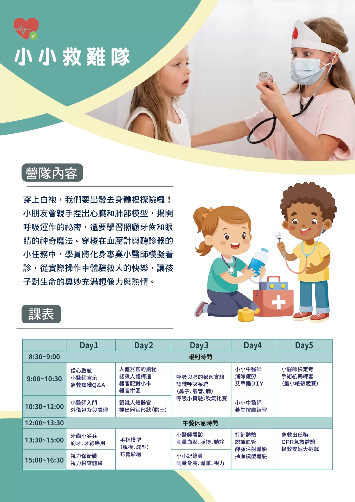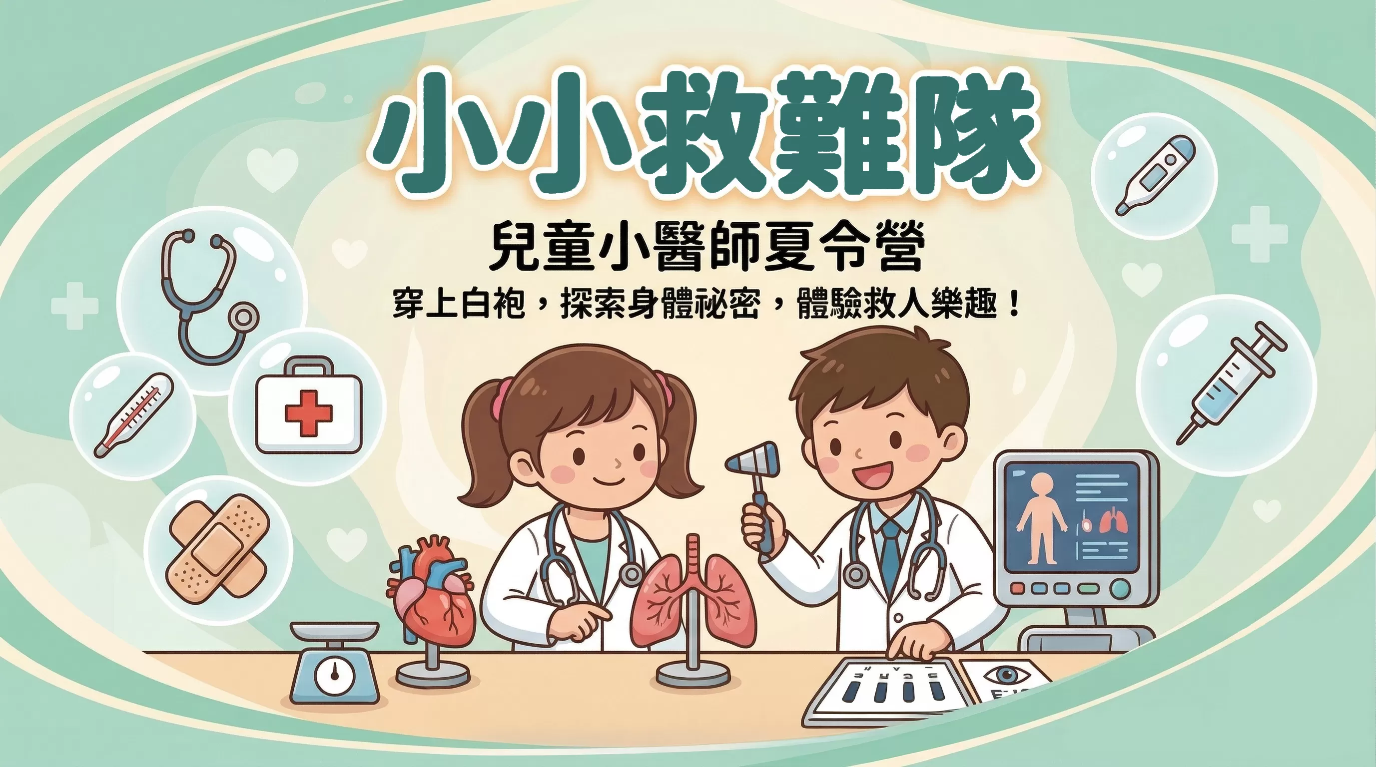 您是否也曾夢想成為一名救人無數的醫生?您是否也對神祕的人體充滿好奇?「小小救難隊」夏令營,將帶領孩子走進醫療的世界,開啟一段充滿歡樂和知識的探索之旅!