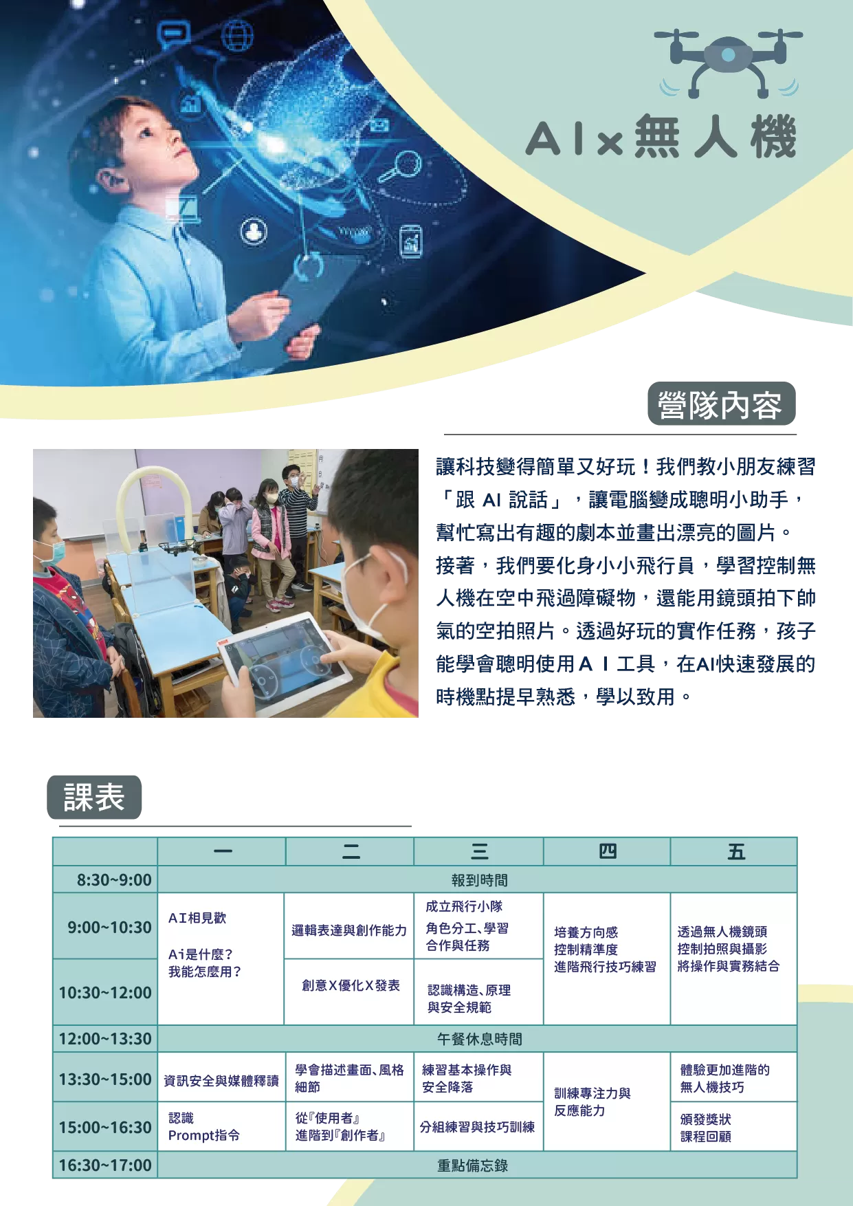 課程以 AI 生成與無人機操控為主軸,讓孩子在動手做中掌握數位工具,將科技素養轉化為解決問題的能力: